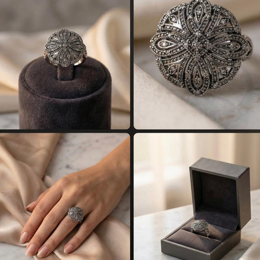 Diamond Silver 925 Ring •Chunky Silver Ring •Vintage Style Ring •Floral Diamond Ring •Victorian Diamond Ring