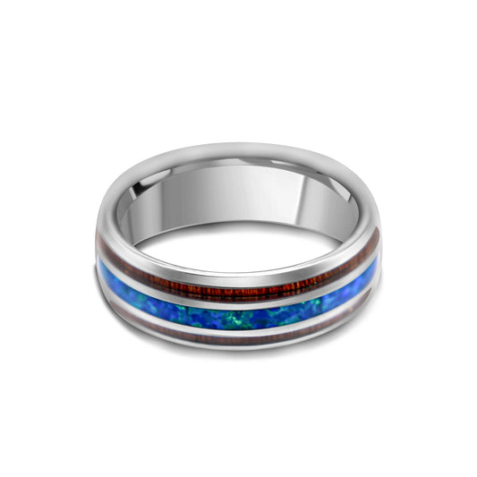 Tungsten Koa Wood and Opal Ring •8.00 mm Ring Band for Men and Woman •Blue Opal Ring •Khoa Wooden Ring